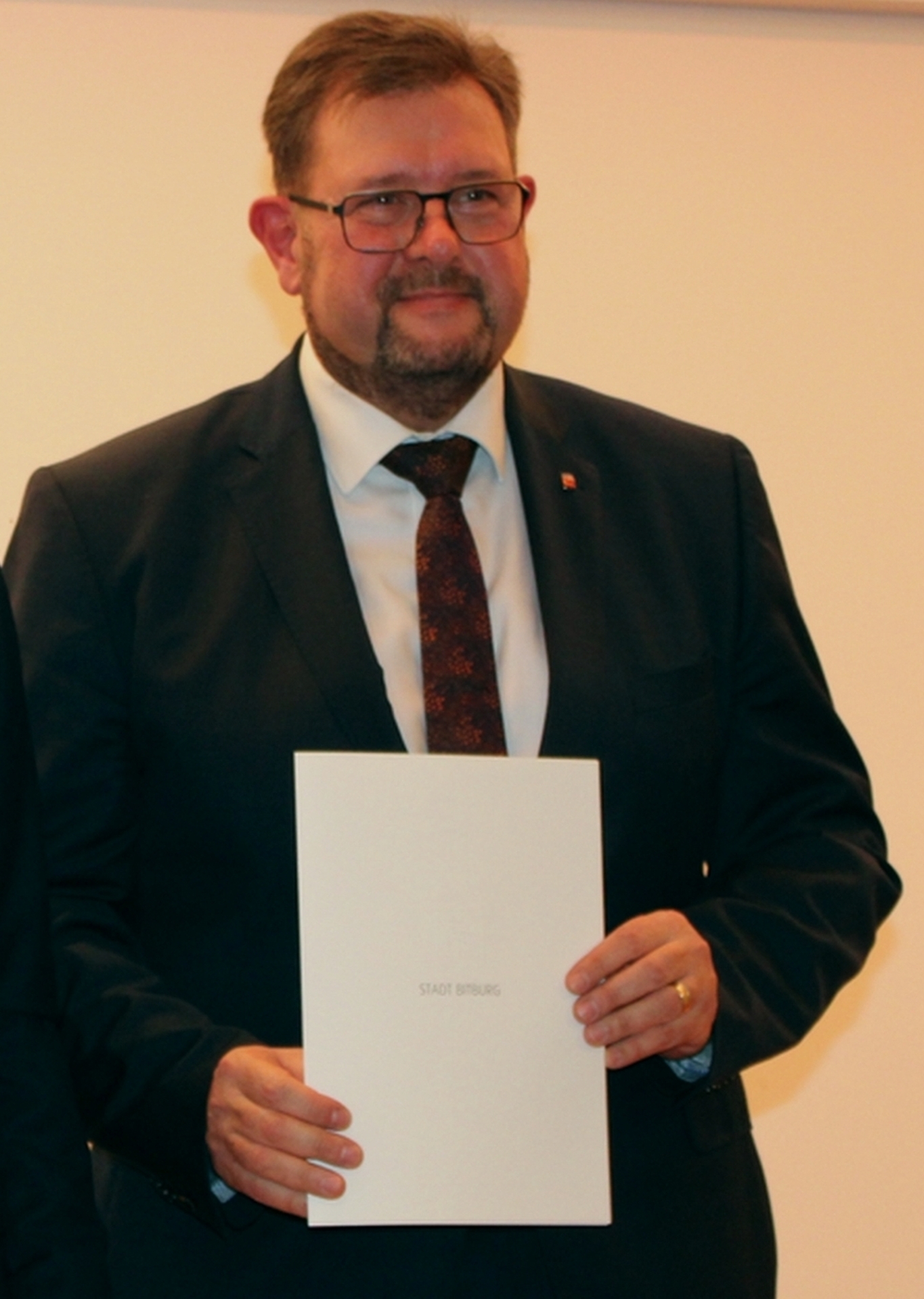 Nach 16-jähriger Amtszeit hat sich Joachim Kandels als Bürgermeister der Stadt Bitburg verabschiedet. Gemeinsam mit Mandatsträgern, Amts- und Arbeitskollegen feierte Kandels im Festsaal des Hauses Beda. Die Urkunde überreichte der Erste Beigeordnete Michael Ringelstein, während Ratsmitglied Andreas Gerten die Laudatio hielt. Weitere Ansprachen hielten Landrat Andreas Kruppert und Personalratsvorsitzender Friedbert Mayer. Joachim Kandels verabschiedete sich mit den Worten „Es war mir eine Ehre – danke, das war‘s“ bei den Bitburgern.