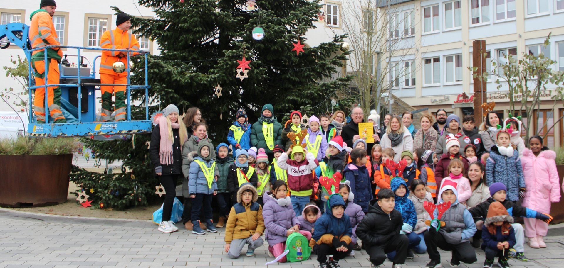 Für den großen Weihnachtsbaum auf dem Grünen See unterhalb des Rathauses hatten in diesem Jahr die Kinder der KiTa Altes Gymnasium und KiTa Zuckerborn sowie Kinder der Afa mit ihren Erzieherinnen Baumschmuck gebastelt.