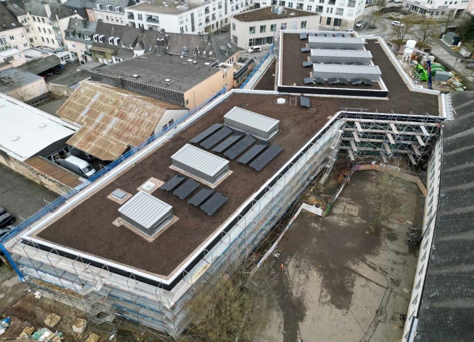 Der Neubau der Grundschulturnhalle und die Erweiterung der Grundschule Bitburg-Süd schreiten zügig voran. Wie aktuelle Luftbilder verdeutlichen, sind die Arbeiten an der Dachabdichtung, die Installation der Photovoltaik-Anlage sowie die extensive Dachbegrünung weitestgehend abgeschlossen. Damit sind wichtige Hüllenarbeiten im oberen Bereich des Gebäudes erfolgreich beendet.