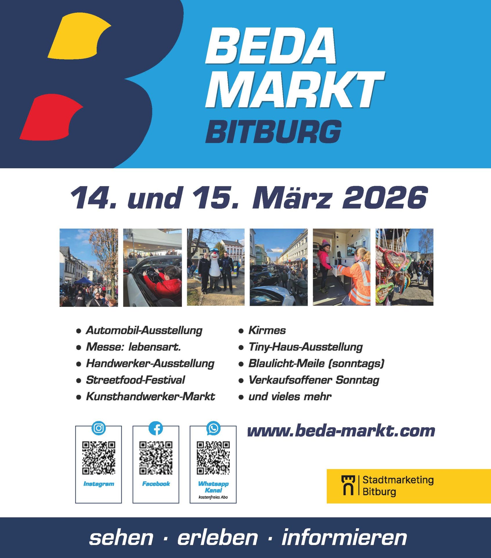 Bitburg, 14. und 15. März 2026 – Unter dem bewährten Motto „Sehen – Erleben – Informieren“ verwandelt sich Bitburg am zweiten Märzwochenende wieder in ein pulsierendes Zentrum für Mobilität, Handwerk und Lifestyle. Gemeinsam mit der regionalen Wirtschaft präsentiert die Stadt ein abwechslungsreiches Programm, das Tradition und innovative Trends gekonnt verbindet.
