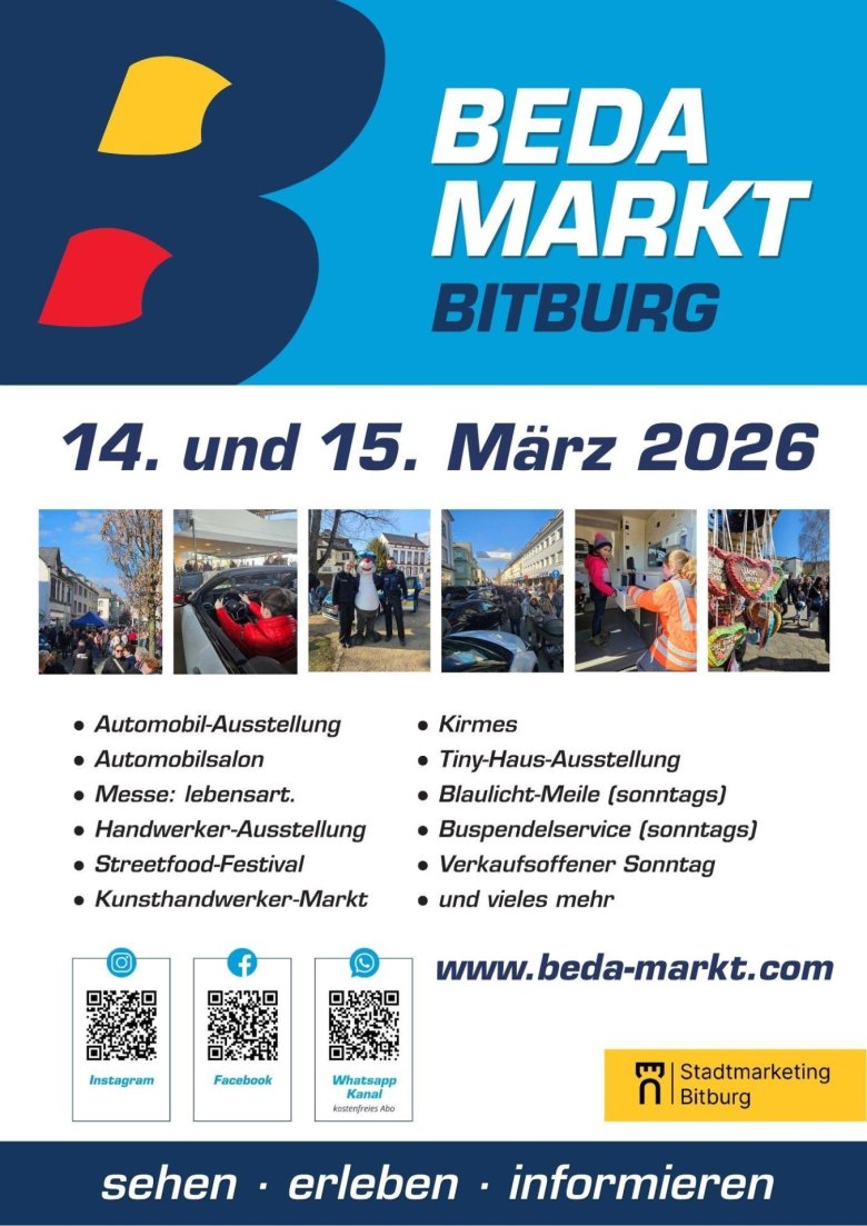 Die feierliche Eröffnung findet am Samstag um 10:00 Uhr in der Handwerker-Ausstellung im Autohaus Eifel Mosel (Ottostraße 2) statt. In Kooperation mit der Volksbank Trier Eifel eG wird der Beda Markt dort feierlich eröffnet.