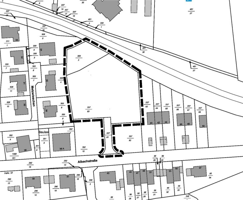 Abbildung: Geltungsbereich des Bebauungsplans „Albachstraße“ (schwarz gestrichelt), genordet, ohne Maßstab.