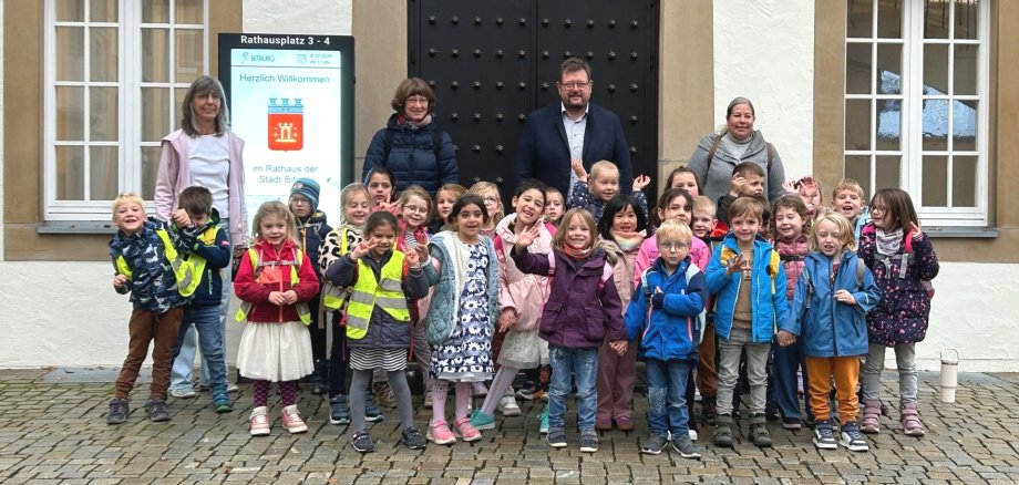 Im Anschluss an den Besuch im Rathaus begaben sich die Kinder mit ihren Erzieherinnen auf einen kleinen Stadtrundgang, um weitere Darstellungen der Gäßestrepper im Stadtbild zu entdecken, so auch den Gäßestrepperbrunnen in der Fußgängerzone.