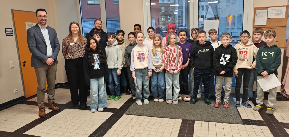 Die Schülerinnen und Schüler der einzelnen Jahrgangsstufen hatte sich ein abwechslungsreiches Programm überlegt, um Herrn Jakobs an der Schule willkommen zu heißen. Mit einem Lied der ersten Klassen, einem Begrüßungs-Akrostichon der zweiten Klassen und dem Südschul-Rap der vierten Klassen zeigten die Kinder ihre Freude über den Besuch. Die Schülerinnen der dritten Klassen hatten sich ein Quiz mit Fragen zur Geschichte und zu Fakten über die Südschule ausgedacht, welches Herrn Jakobs vor besondere Herausforderungen stellte, da er selbst ehemaliger Schüler der Südschule ist. Es zeigte sich aber, dass der neue Bürgermeister noch sehr gut über die Schule informiert ist und fast alle Fragen richtig beantworten konnte.
