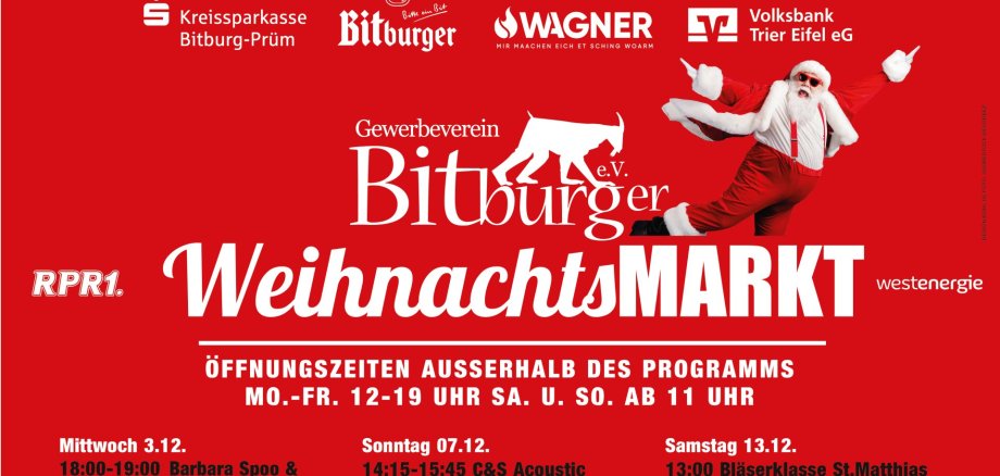 Die Stadt Bitburg wünscht allen Einheimischen und Besuchern eine erlebnisreiche und angenehme Weihnachtszeit in unserer schönen Stadt.