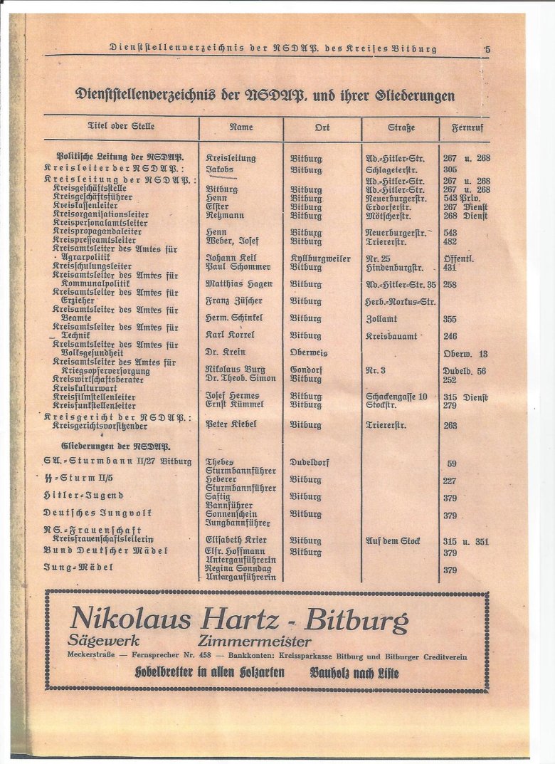 © Stadtarchiv BitburgListe von Funktionären der NSDAP aus dem Telefonbuch von Bitburg 1938