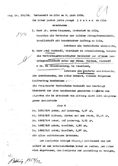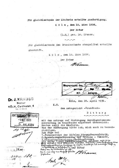 Verkauf der Strumpfwarenfabrik in Bitburg an Wiethoff, Veltins/Schmallenberg 1936