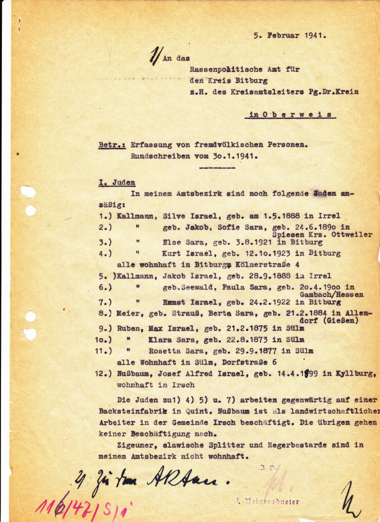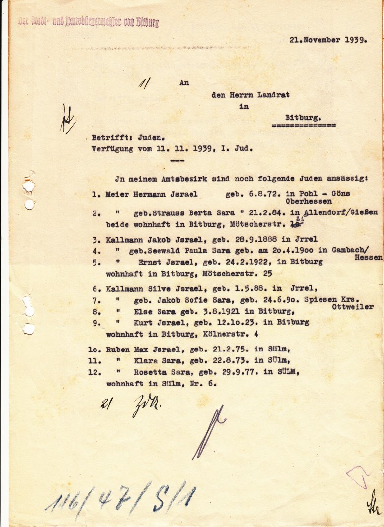 © Stadtarchiv Bitburg21.11.1939 Auflistung der 1939 in Bitburg und Sülm lebenden Juden (Quelle Stadtarchiv Bitburg)Weitere Dokumente aus dem Jahr 1939: