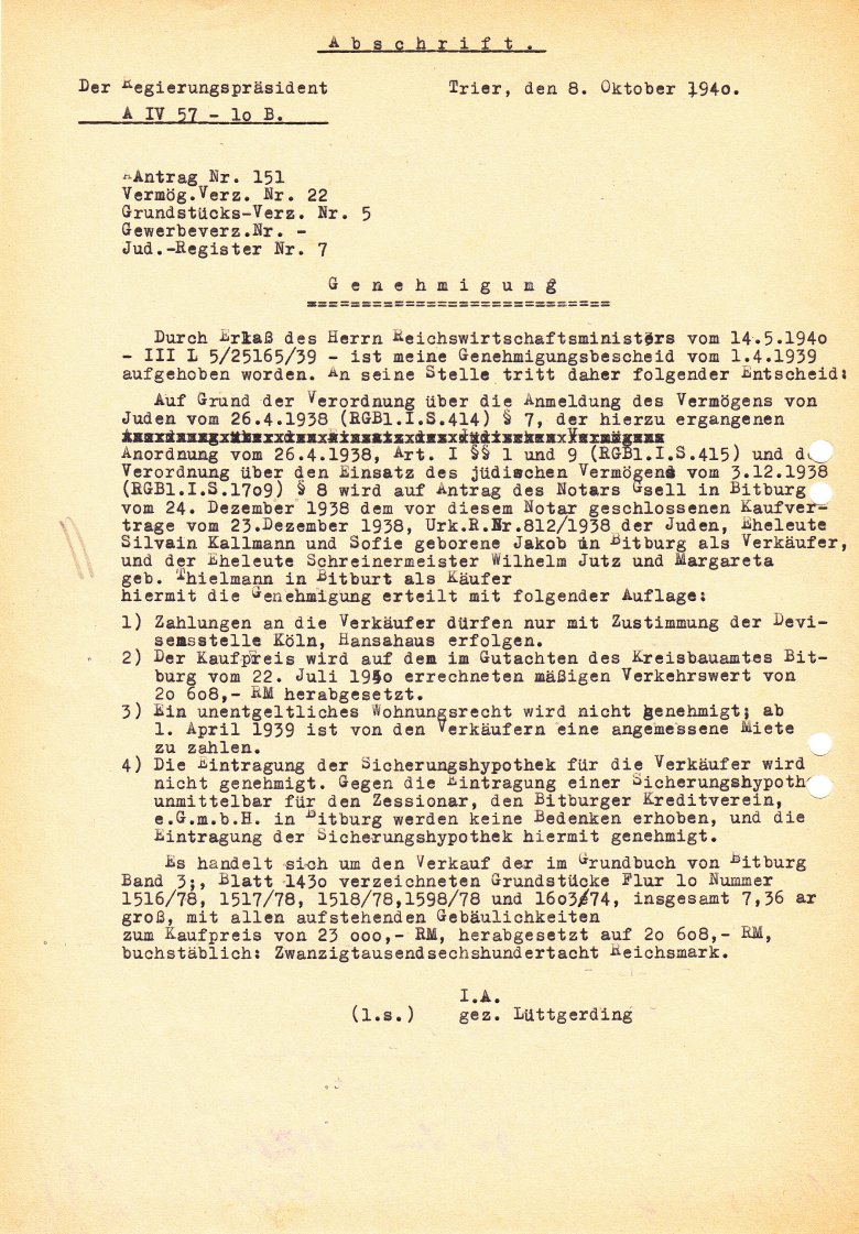 © Stadtarchiv Bitburg08.10.1940: Genehmigung des Hausverkaufs von Silve Kallmann an Jutz mit Vermietung des verkauften Hauses an Kallmann