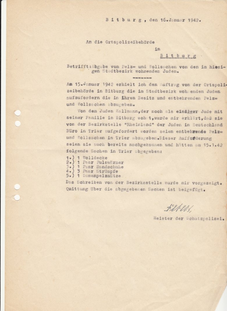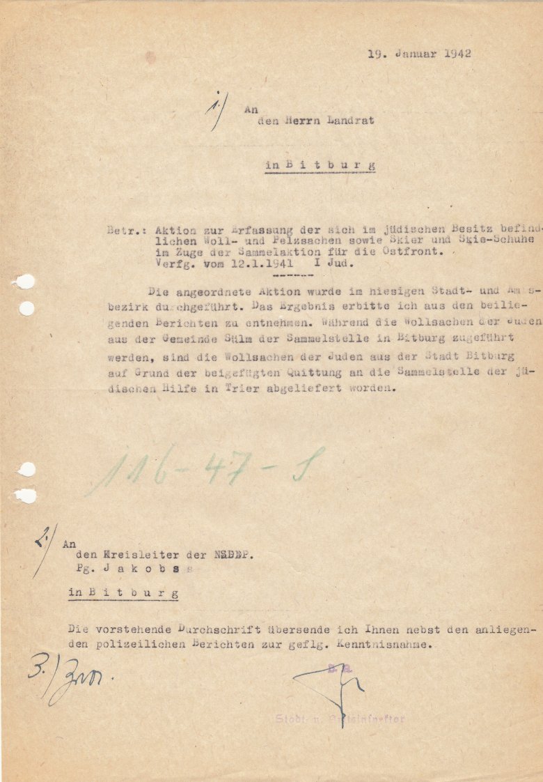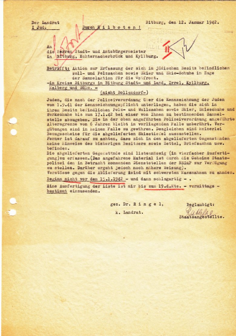 12.01.1942 Erfassung von Woll- und Pelzsachen sowie Skikleidung von Juden im Amtsbezirk Bitburg