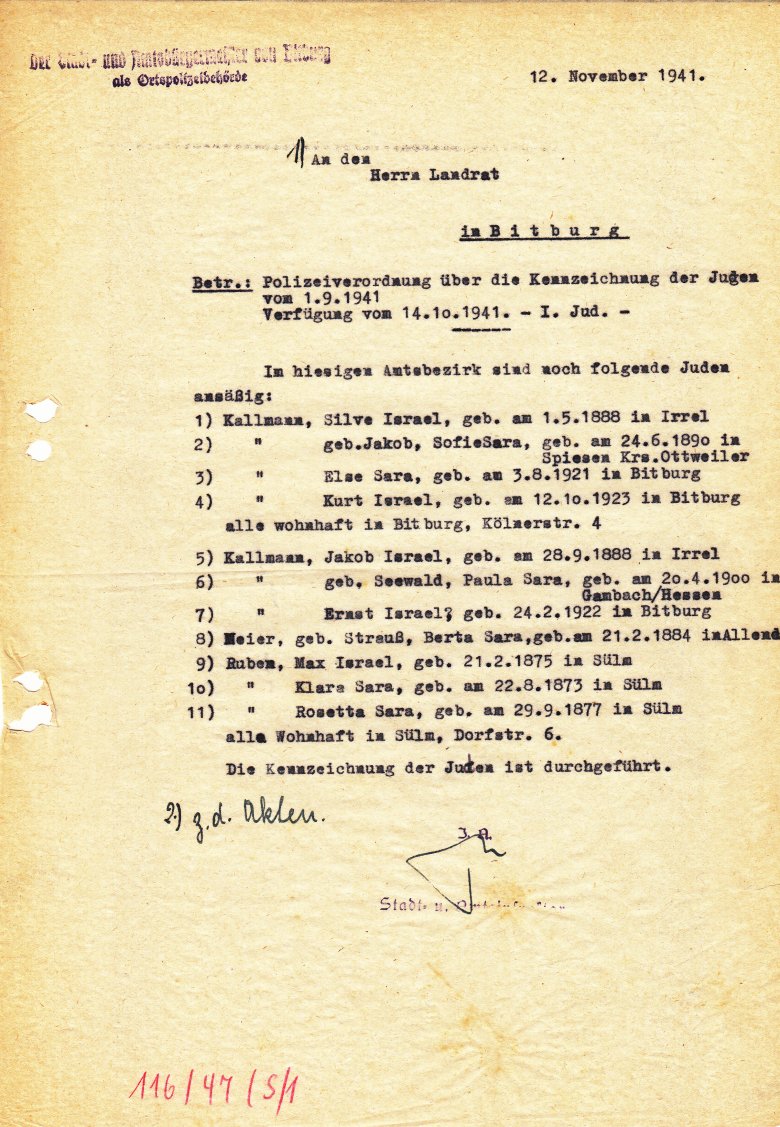 © Stadtarchiv Bitburg12.11.1941: Kennzeichnung der Juden in Bitburg mit Judenstern
