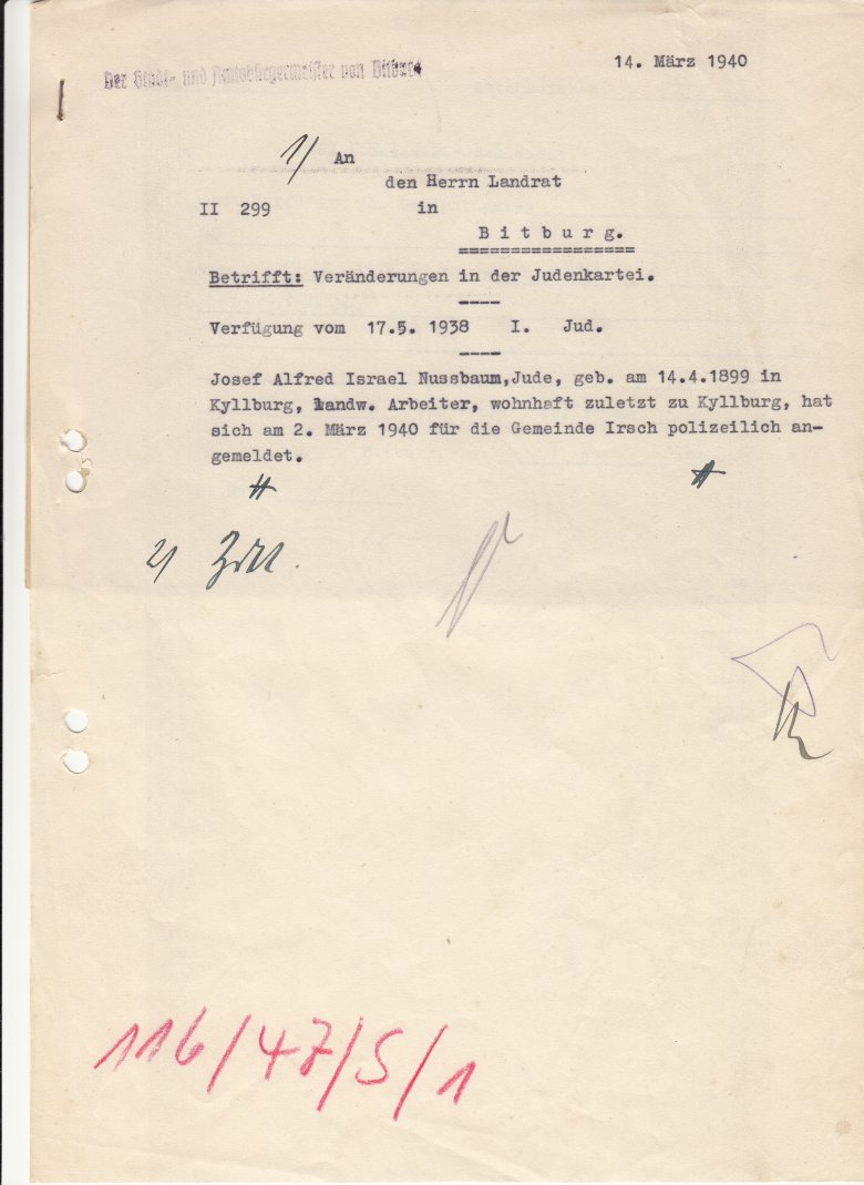 © Stadtarchiv Bitburg14.3.1940 Veränderung in der Judenkartei bzgl. Zuzug Josef Alfred Israel Nusbaum aus Kyllburg nach Irsch