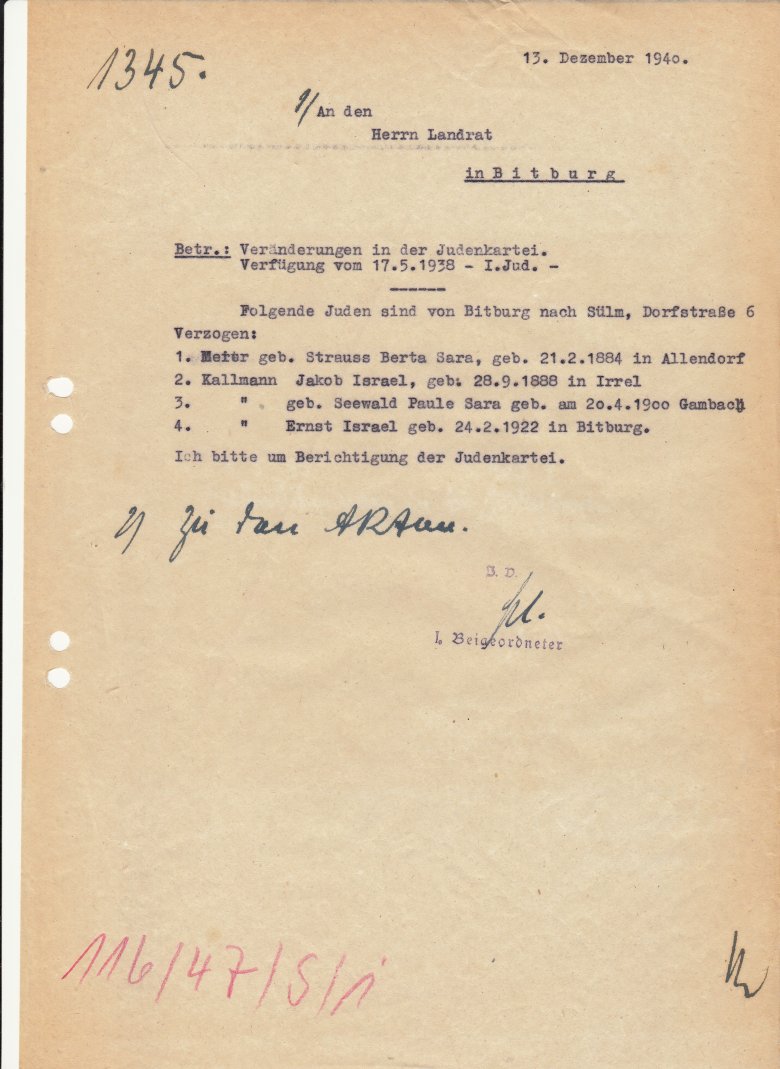 © Stadtarchiv Bitburg13.12.1940: Umzugsmeldung Jakob Kallmann und Berta Meier nach Sülm