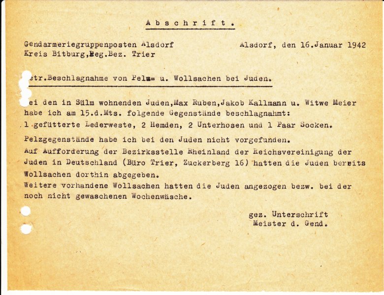 © Stadtarchiv Bitburg16.01.1942: Beschlagnahmung von Woll- und Pelzsachen der Juden (Kallmann, Ruben, Meier) in Sülm