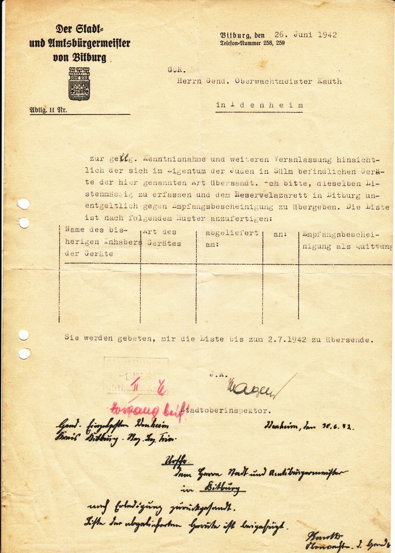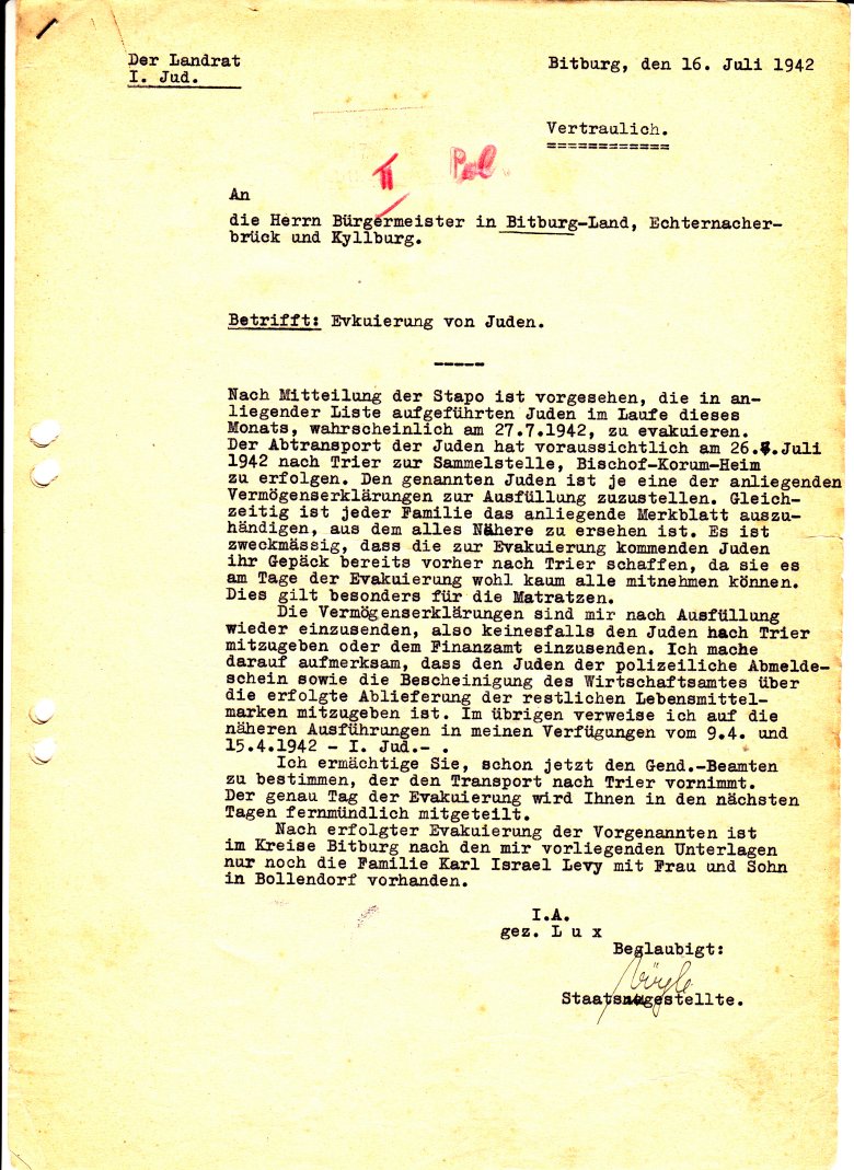 © Stadtarchiv Bitburg16.07.1942: Verfügung des Landrats Kreis Bitburg betreffs "Evakuierung der Juden"