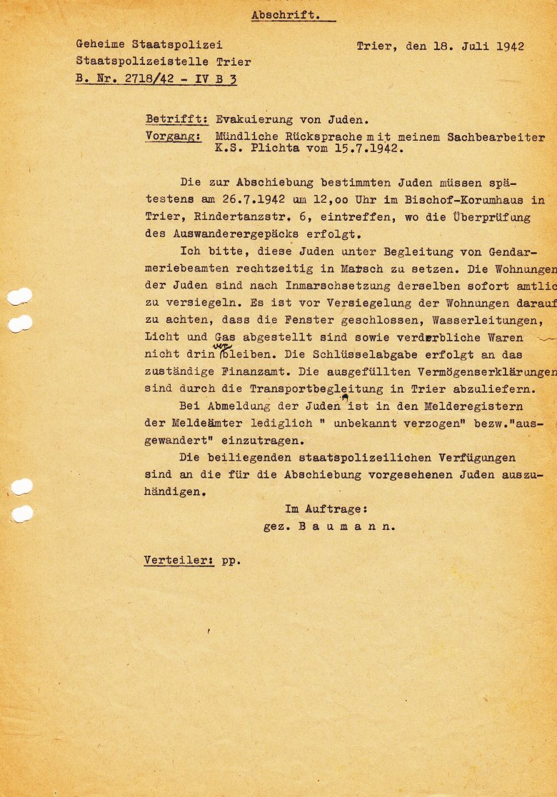 © Stadtarchiv Bitburg18.07.1942: Anordnung des Ablaufes der zur "Evakuierung" vorgesehenen Juden