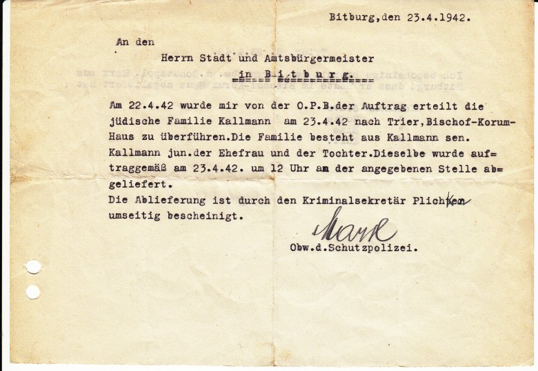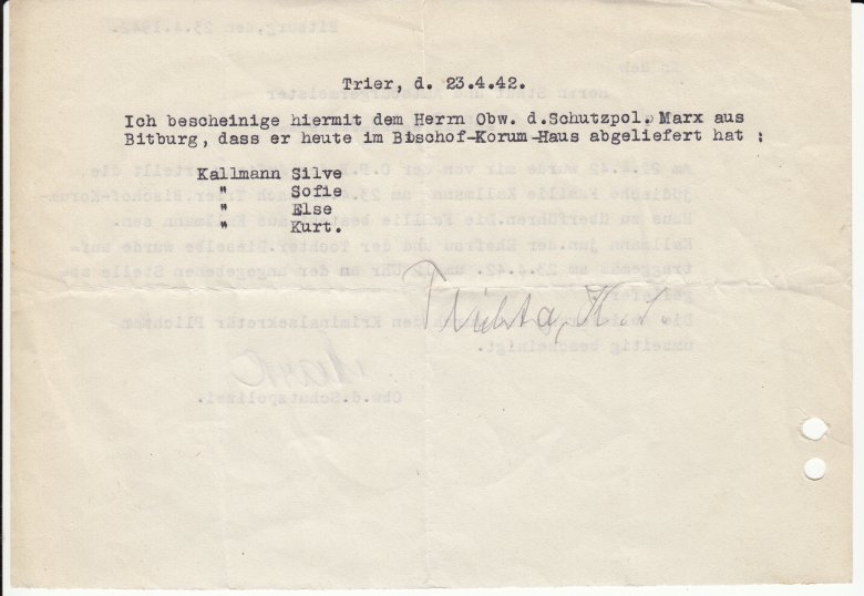 © Stadtarchiv Bitburg23.04.1942: Bescheinigung der Ablieferung der Familie Silve Kallmann in Trier (Rückseite)