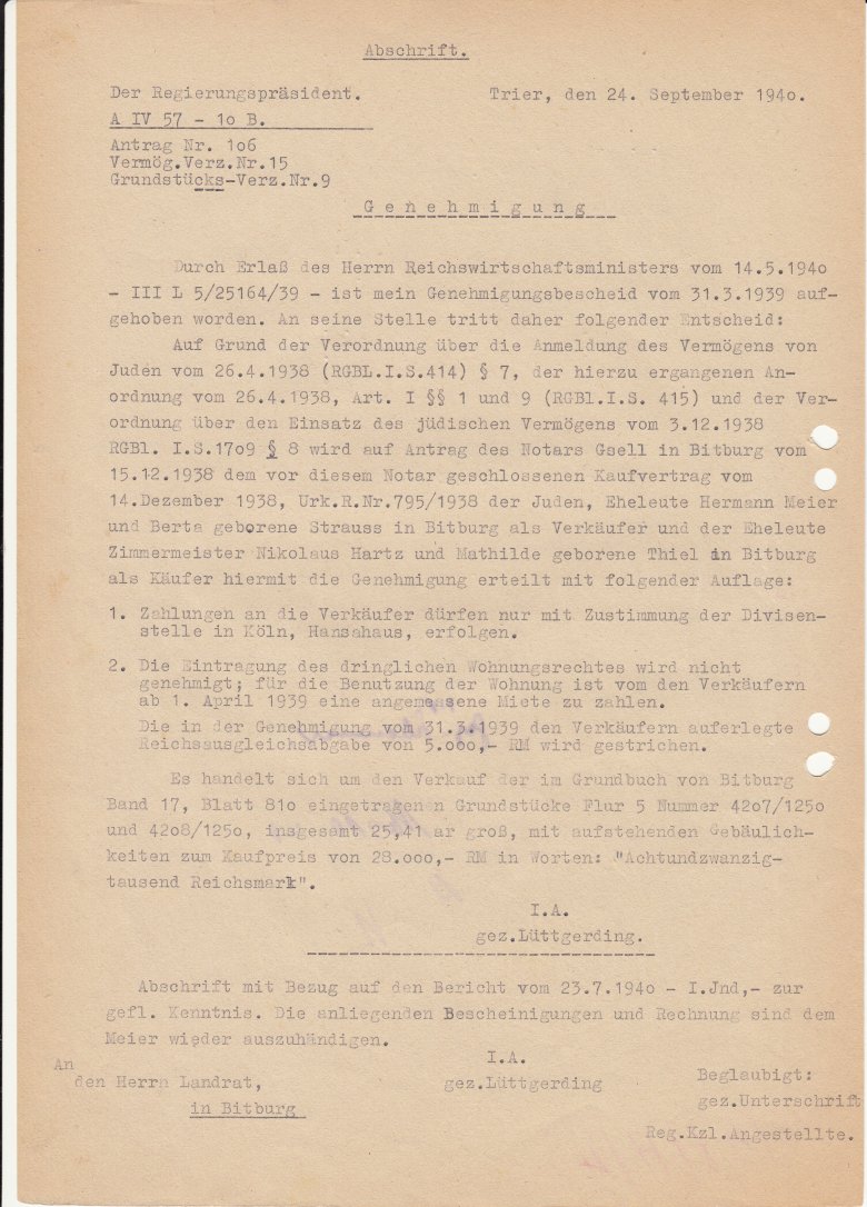 © Stadtarchiv Bitburg24.09.1940: Genehmigung des Regierungspräsidernten über den Hausverkauf Hermann Meiers an die Eheleute Hartz
