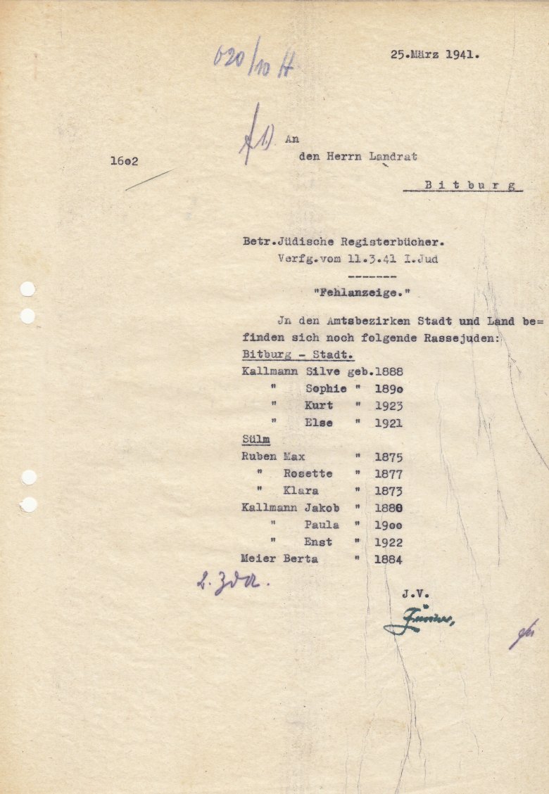 © Stadtarchiv Bitburg25.03.1941: Liste von im Amtsbezirk Bitburg wohnenden Juden