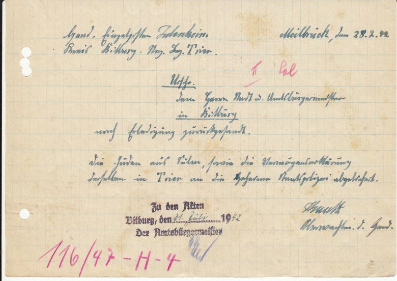 © Stadtarchiv BitburgDokumente zur jüdischen Verfolgung 1942 (Quelle Stadtarchiv Bitburg, Signaturen 100 025,026)