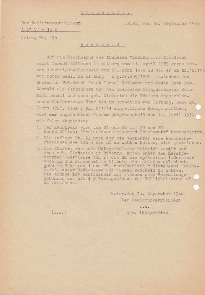 © Stadtarchiv Bitburg30.09.1940 Beschwerde gegen Herabsetzung des Kaufpreises beim Verkauf des Hauses Jakob Kallmann