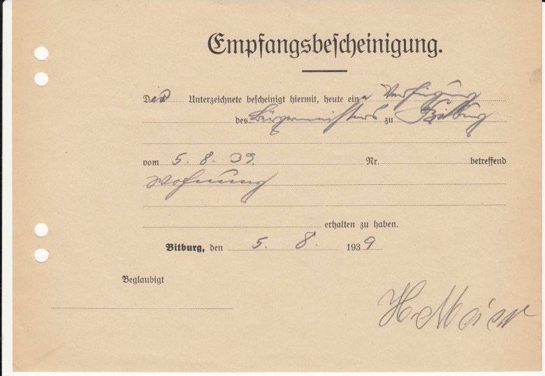 © Stadtarchiv BitburgEmpfangsbestätigung für die Aufforderung vom 05.08.1939, Unterschrift Meier (Quelle Stadtarchiv Bitburg)