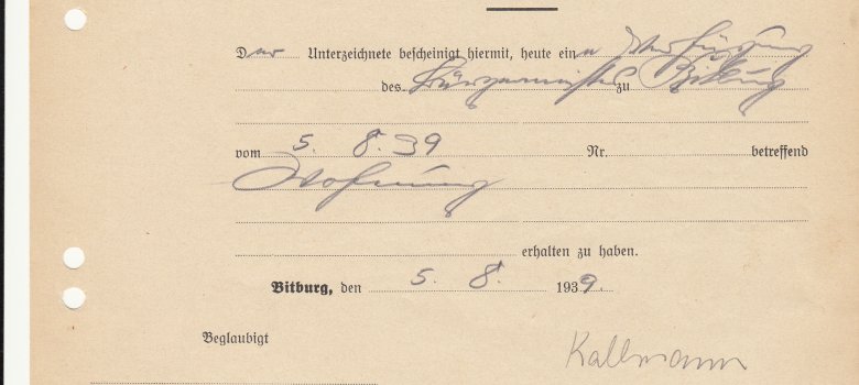 © Stadtarchiv BitburgEmpfangsbestätigung für die Aufforderung vom 05.08.1939, Unterschrift Kallmann (Quelle Stadtarchiv Bitburg)