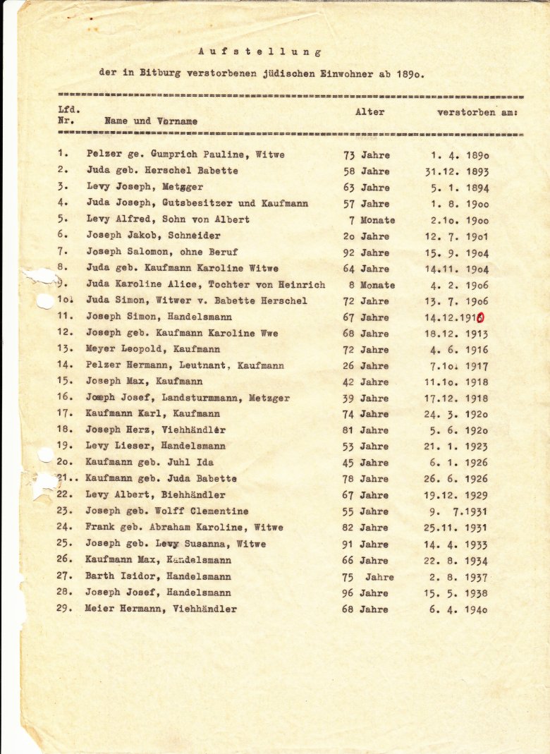 01.05.1940 Liste von natürlich verstorbener Juden in Bitburg