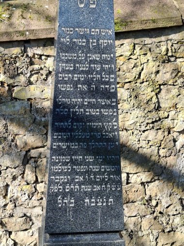 Ein frommer und rechtschaffener Mann, Yosef, Sohn des Mor (Mor = Herr oder Rabbi) Levi. Möge er in Frieden ruhe, sein Duft ewig im Paradies weilen. Er ertrug sein Leiden viele Tage lang. Gott hat seine Seele von allen Leiden erlöst. Sein Schicksal wird im Schatz des Lebens liegen und seine Seele wird in Frieden ruhen. Am Ende der Tage wird er auferstehen und die Frucht seiner Taten essen, weil er hier in Gerechtigkeit gewandelt ist. Er starb im Alter von 58 Jahren am Vorabend des 6. Aw. Er wurde begraben am Freitag den 8. Aw im Jahr 5669 nach der kleinen Zählung (26. Juli 1909).