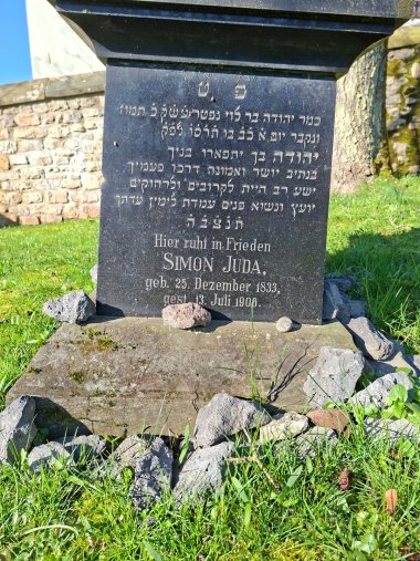 Deine Schritte waren voller Heil für Nahestehende und Ferne. Als Berater und angesehener Mann standest du deiner Gemeinde zur Seite.Seine Seele sei eingebunden in das Bündnis des Lebens.Simon Juda wurde in Neumagen geboren. Er zog Ende der 1850er Jahre nach Bitburg und übte den Beruf als Kaufmann aus. Von seiner ersten Zeit in Bitburg sind Briefe erhalten, die er und seine Frau Babette an die Verwandtschaft schrieben. Die Bezeichnung Rabbi deutet darauf hin, dass Simon Juda eine zeitlang Oberhaupt der jüdischen Gemeinde in Bitburg war.