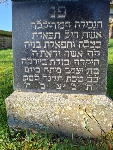 Sie starb ehrenvoll am ersten Kislew und wurde am zweiten Kislew mit großen Ehren bestattet. Sie wurde am vierten Kislew erneut mit großen Ehren bestattet. Ihre Seele sei eingebunden in das Bündnis des Lebens.Diese Grabinschrift ist für Karoline Juda, geb. Kaufmann, angefertigt worden. Karoline Juda war die Frau von Joseph Juda, einem in Neumagen geborenen Gutsbesitzer, Kaufmann und Viehhändler. Joseph Juda wurde in Neumagen geboren und war ein Bruder von Simon Juda.