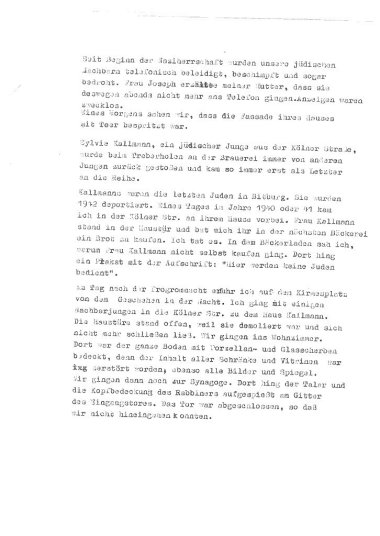 ,,Ich erinnere mich, dass in den frühen 1930er Jahren die Braunhemden in großen schwarzen Mercedes-Wagen am Grünen See und in der Kölner Straße zusammenkamen, wo jetzt das Eifelbräu ist. Dort waren ein Restaurant und ein Kino und die katholische Bücherei nebenan. Es begann ziemlich schwierig zu werden für uns, besonders nach dem, was wir von Radio Luxemburg hörten. Diese Braunhemden waren sicher nicht aus Bitburg, wir kannten keinen einzigen, sie waren wahrscheinlich aus Trier oder so. "