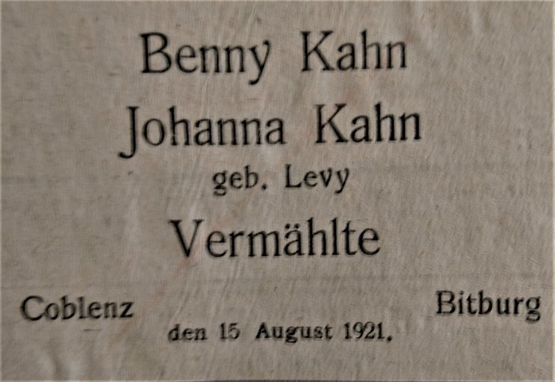Heiratsanzeige Benny Kahn und Johanna Levy aus der Bitburger Zeitung 1921