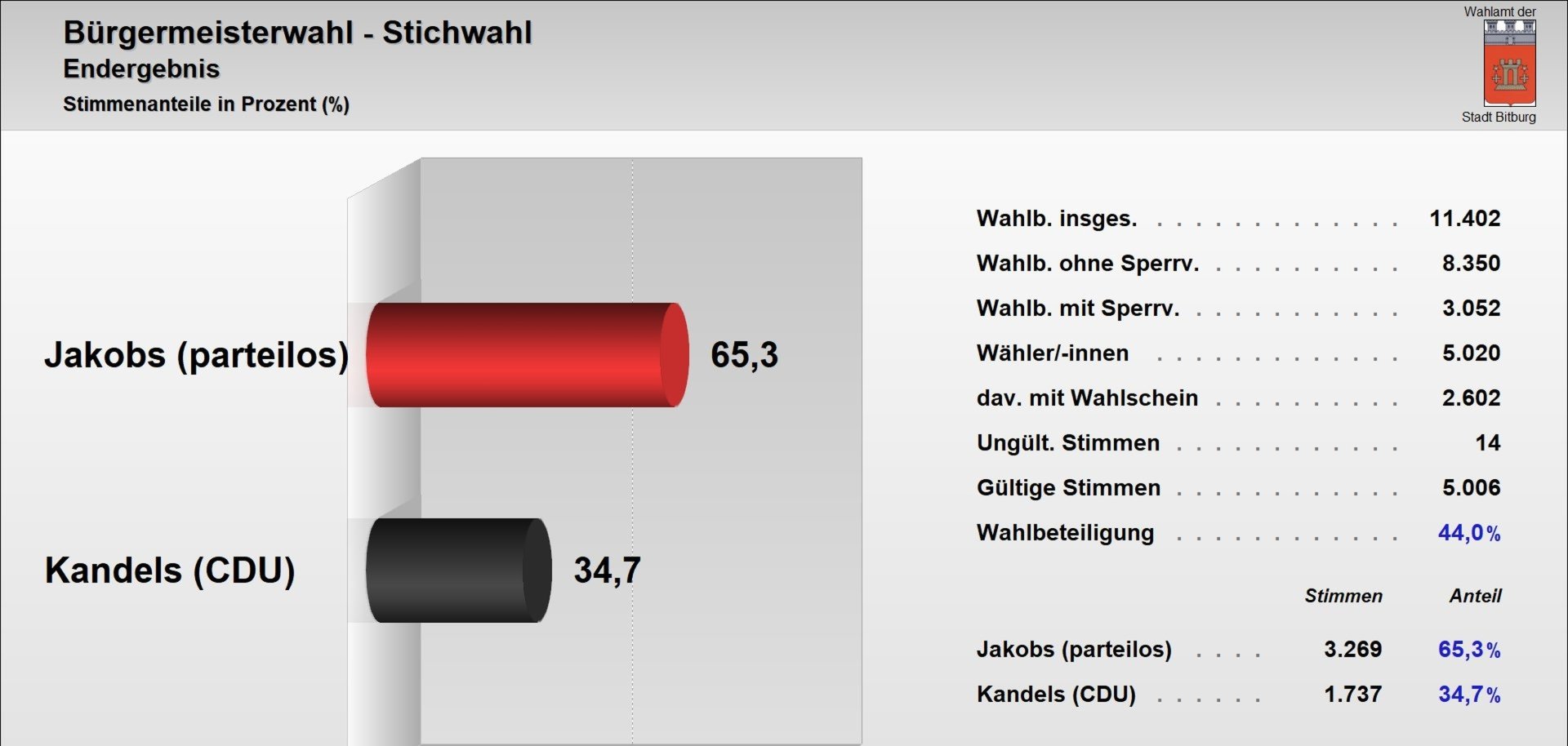 Heiko Jakobs wird neuer Bürgermeister der Stadt Bitburg. Am Ende des Stichwahl-Abends am 29. Juni 2025 setzte sich Jakobs gegen den Amtsinhaber Joachim Kandels mit 65,30 Prozent der Stimmen durch. Bürgermeister Kandels wird das Amt Mitte Dezember 2025 an seinen Nachfolger übergeben.