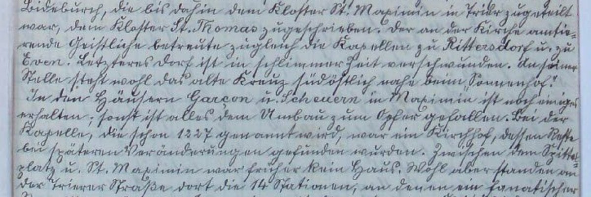 Schon im Jahre 1836 hatte die Stadt einen artesischen[1] Brunnen bei der unteren Kirche (St. Peter) durch Rauen aus Nattenheim bohren lassen, der rund 3.000 Taler gekostet hat. Wasser fand in diesem Brunnen genug für ganz Bitburg, allein man hoffte noch mehr zu finden und ließ tiefer bohren. Ein unglückseliger Schuss aber sprengte den Fels und das schöne Wasser verschwand. Noch lange wollten die Leute bei stiller Nacht das Wasser rauschen hören beim zweiten Treppentritt zur Peterskirche, gegenüber dem Hause Schilz.