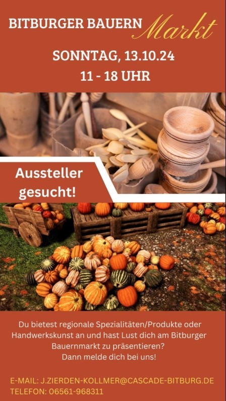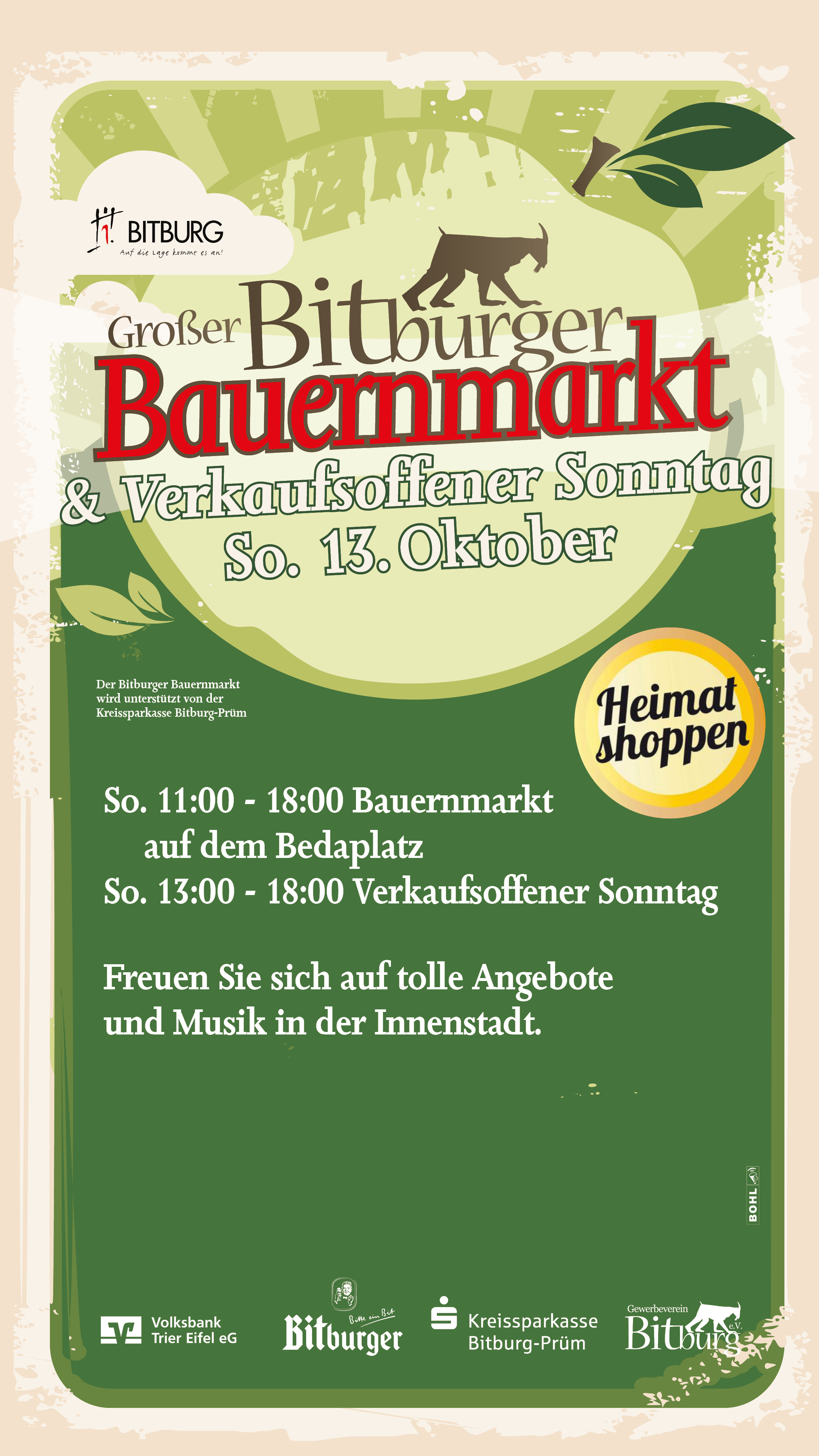Am Sonntag, 13. Oktober 2024, lädt die Stadt Bitburg ab 11:00 Uhr zum traditionellen Bauernmarkt ein. Nahezu 50 Aussteller bieten beim größten Bauernmarkt der Region „heimische Qualität und Vielfalt“ zum Kaufen und Genießen auf dem Bedaplatz in Bitburg.