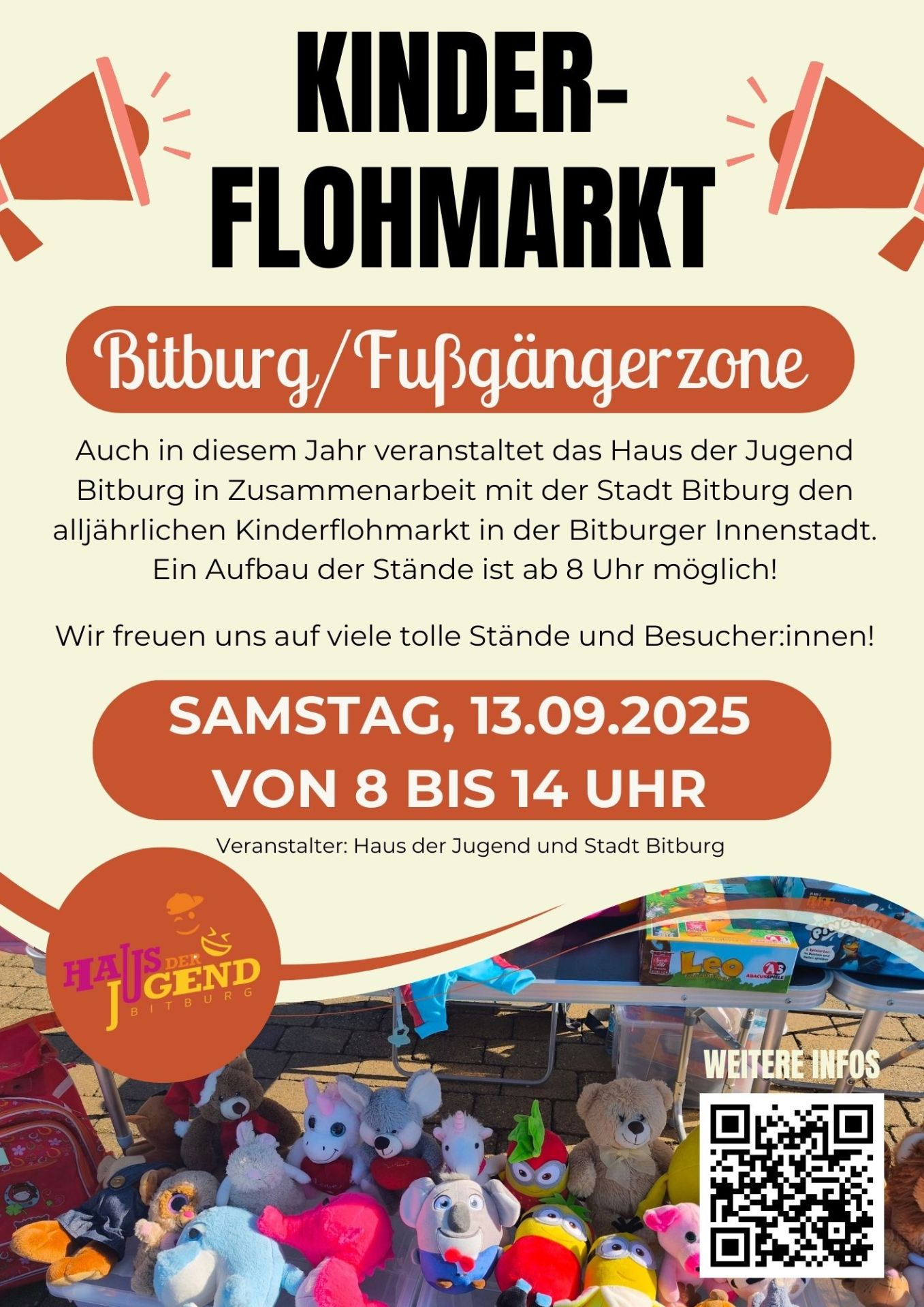 Auch in diesem Jahr veranstaltet das Haus der Jugend Bitburg in Zusammenarbeit mit der Stadt Bitburg den alljährlichen Kinderflohmarkt in der Bitburger Innenstadt. Der Flohmarkt findet am Samstag, 13. September 2025 in der Bitburger Fußgängerzone statt, Start ist um 8.00 Uhr.